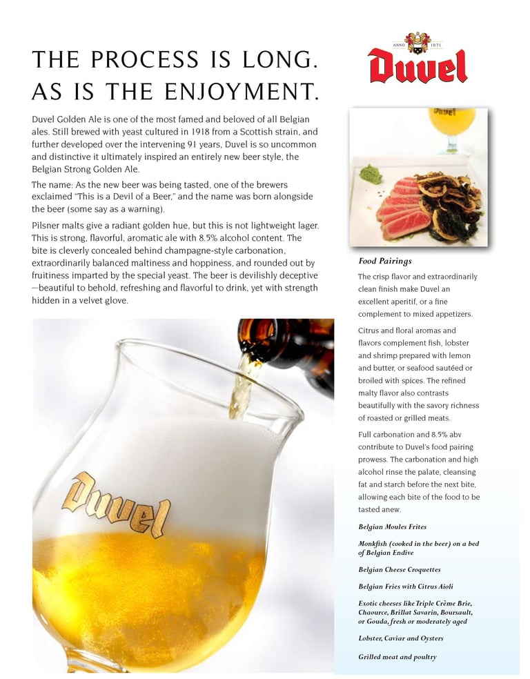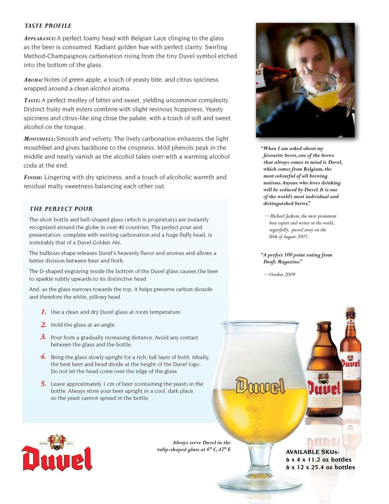 Duvel has set the standard for Belgian Strong Golden Ales since they invented them back in 1923. Launched to celebrate the end of World War 1, the name came from the Flemish for "devil" due to its deceptively hidden strength.